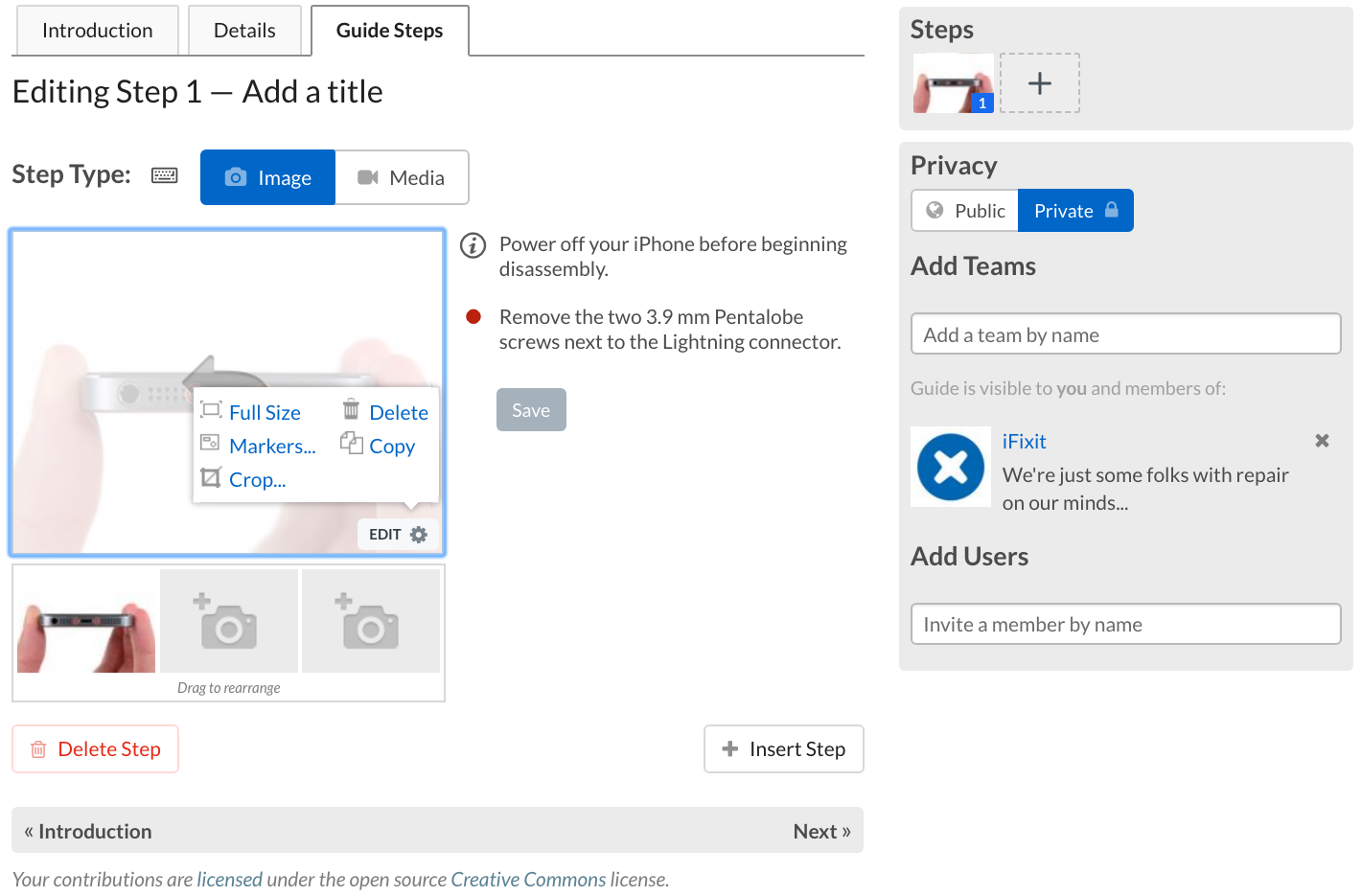 Once your photos are in place, you can use iFixit’s markup system to highlight the location of screws and other key components when necessary.